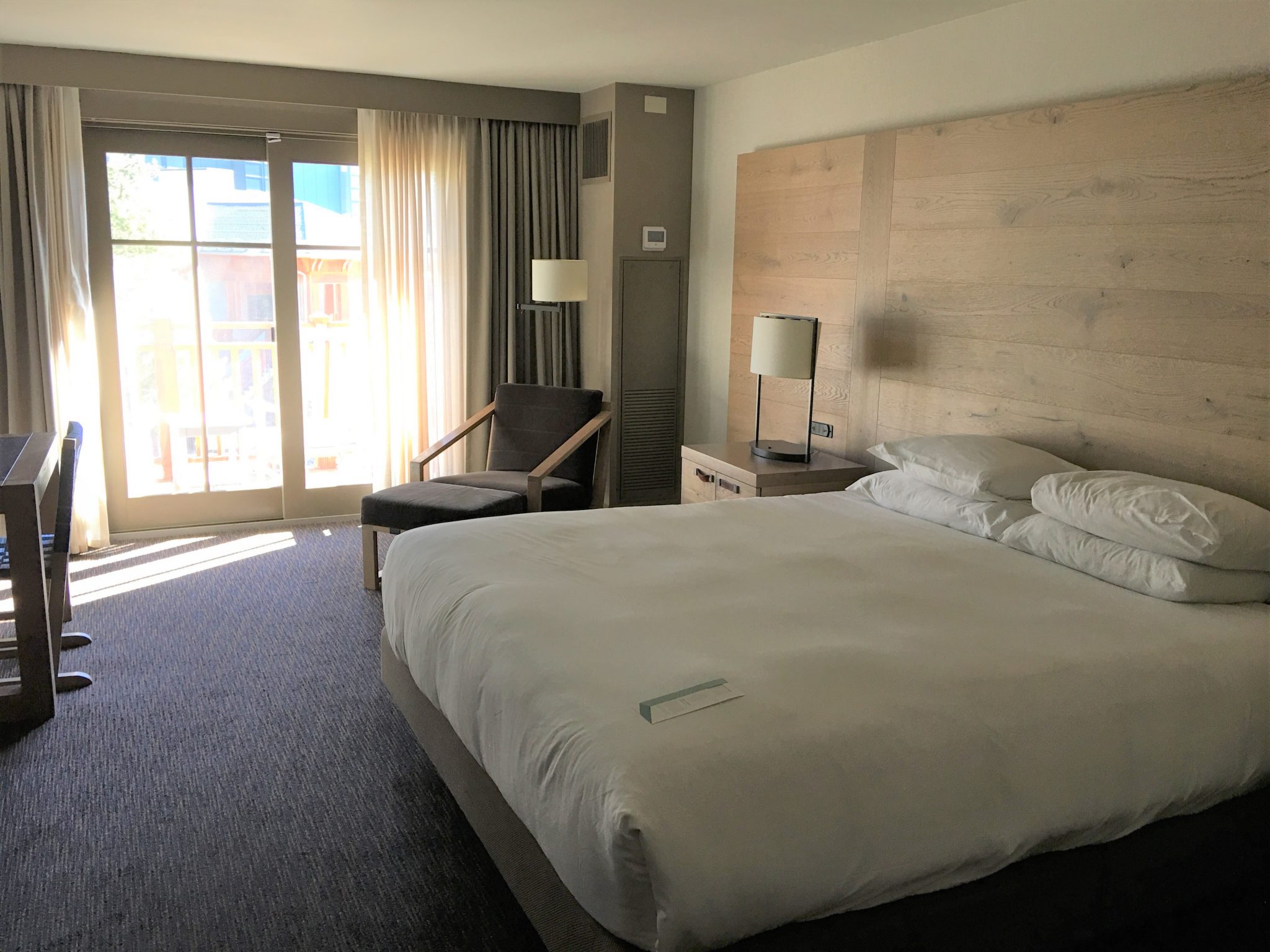 ロッジ風なホテル・ロビーで3匹の可愛い親子熊がお出迎えをしてくれます。チェックイン時にウエルカム・シャンペンをフロントで受取り部屋へ。ちなみに1室1泊につき自動課金となるリゾートフィー($36+税 2018年10月時点) にはこのウエルカム・シャンペン、フィットネスジム利用、スキー具やゴルフバッグの保管、市内電話通話料、ビジネスセンター利用、Fax送受信利用、が含まれてます。利用してもしなくても課金されますので利用しないと損ですね。
