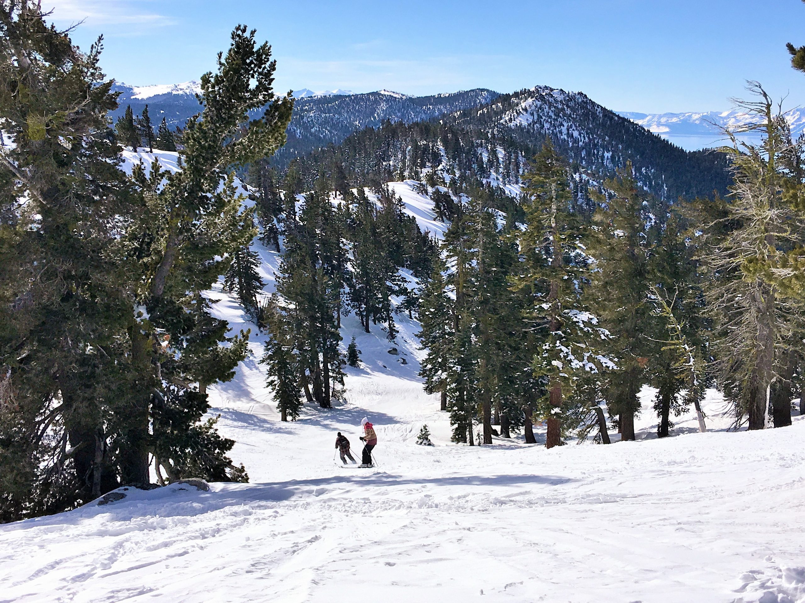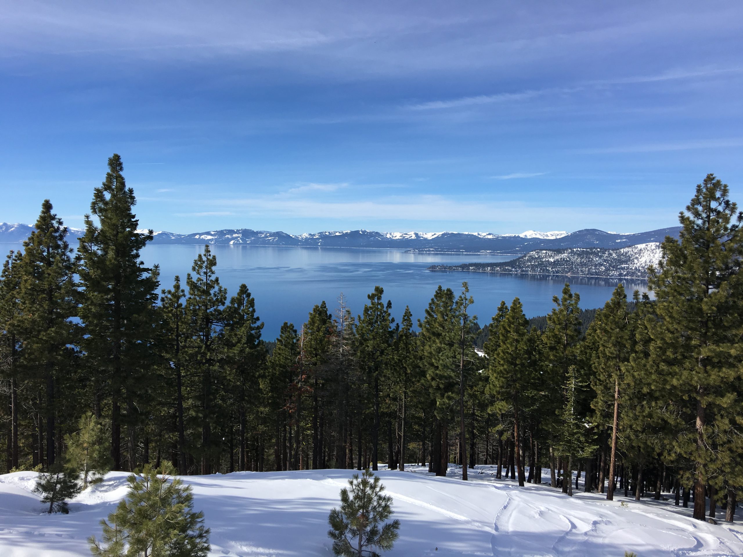 Snowflake Lodgeを出て中級コースのRidge Run~初級コースのFreewayを経てCrystal Expressリフトで山頂へ。さすが山頂、タホ湖ビューはさらに美しさがパワーアップされた息を呑む眺望でしばしうっとりと眺めを堪能。ず~っと眺めていても飽きなかったですが、湖を眺めながらのスキーもしないと!なのでCrystal Ridge方面へ。