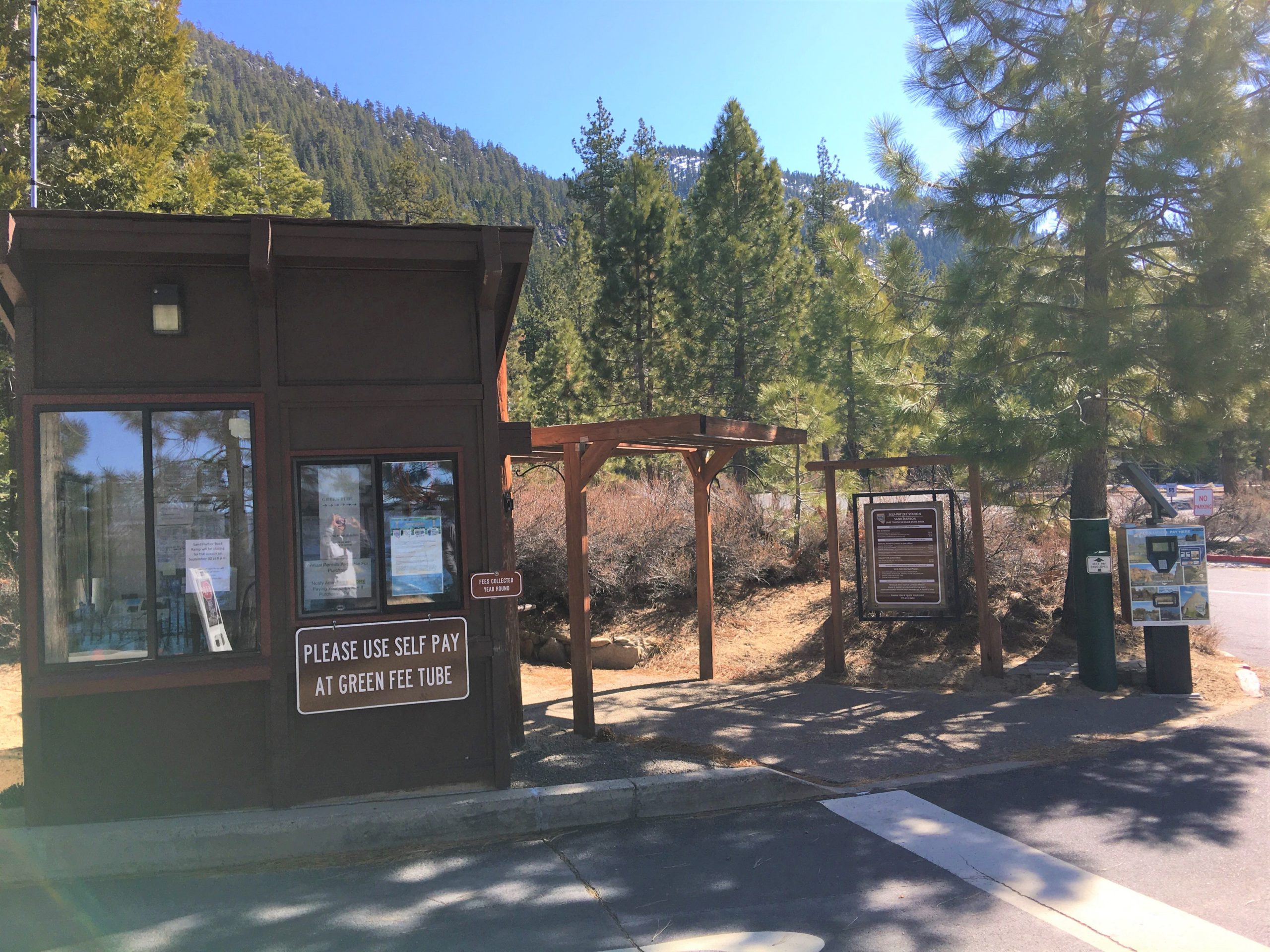 Sand Harbor Lake Tahoe Nevada State Park の北端にあるボートランプの数十メートル手前に到着。この先に州立公園料金所ブースがあり、州立公園に入園する場合は自転車と歩行者は1人2ドルの入園料を払います。この日は犬連れだったのでここでUターン。